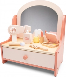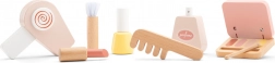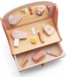 Das Set enthält Holzaccessoires wie eine Bürste, einen Lippenstift, ein Parfümfläschchen, einen Föhn, Nagellack, eine Lidschattenpalette und einen Pinsel, die kreatives Spielen fördern.