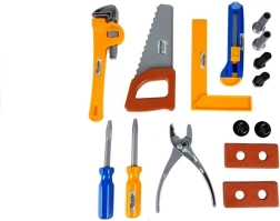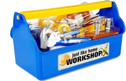 Umfangreiches Set aus Kunststoffwerkzeugen – Säge, Zange, Schraubendreher, Maßstab und mehr – alles im robusten WORKSHOP-Koffer für leichtes Mitnehmen.