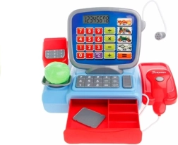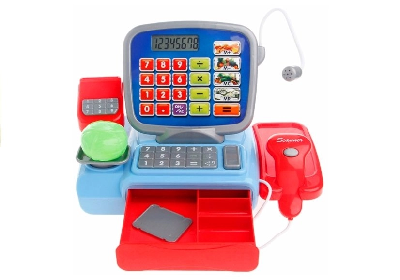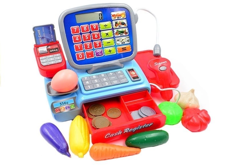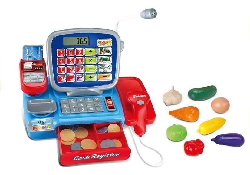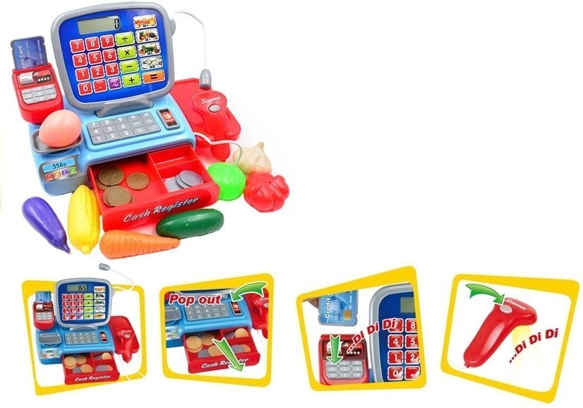 Die funktionale Kasse ist ideal, um Rechnen, Verkauf und Einkauf zu üben. Die elektronische Kasse verfügt über einen funktionierenden Scanner, der beim Drücken Geräusche macht und aufleuchtet. Die Kasse dient auch als Taschenrechner – Sie können Produktpreise addieren und dabei das Rechnen lernen. Die Kasse hat ein Mikrofon-Imitat und eine herausziehbare Münzschublade. Neben der Kasse befindet sich eine Waage, auf der die beiliegenden Lebensmittel gewogen werden können. Das Kind kann eine Zahlungskarte annehmen und mit Münzen bezahlen.