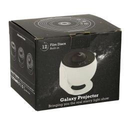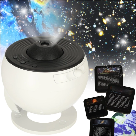 Im Lieferumfang enthalten sind 12 austauschbare Scheiben mit englischen Beschreibungen – zum Beispiel Erde, Sonnensystem, Milchstraße oder Mond. So eignet sich der Projektor hervorragend zum Lernen durch Spiel und weckt das Interesse an Astronomie bei Kindern und Erwachsenen.