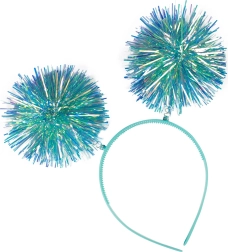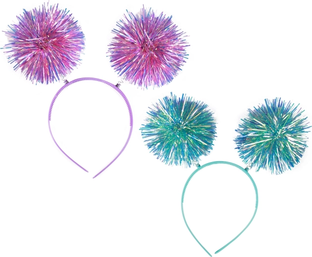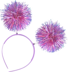 Das Stirnband ist mit zwei großen, glitzernden Pom-Pom-Kugeln geschmückt, die Aufmerksamkeit auf sich ziehen und eine fröhliche Atmosphäre schaffen.
