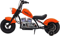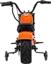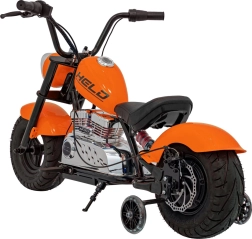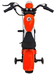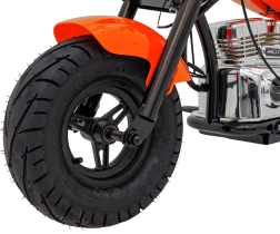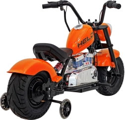 Der elektrische Chopper Warrior in Orange bietet Kindern ein authentisches Fahrerlebnis. Der leistungsstarke bürstenlose 350-W-Motor in Kombination mit dem 36-V-Akkusystem sorgt für sanfte Beschleunigung, die über den Drehgriff (Gasgriff) gesteuert wird. Breite, aufblasbare Reifen 32 × 10 cm gewährleisten guten Grip und Komfort, während Stützräder Anfängern helfen, stabil zu bleiben.