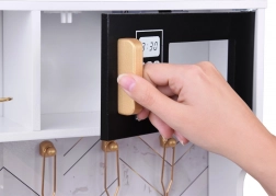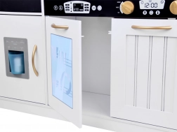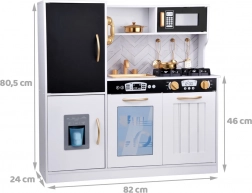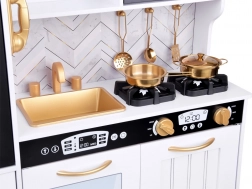 Wecken Sie das Interesse der Kinder am Kochen mit dieser Holz-Küche, die mit Liebe zum Detail gestaltet ist. Die Küche hat ein hauptsächlich weißes Design mit schwarzen und goldenen Details, die für Eleganz sorgen. Kinder können mit Kreide auf die Tafel am Kühlschrank schreiben, das Kochen im Ofen nachahmen und mit realistischen Geräusch- und Lichteffekten Mahlzeiten zubereiten.