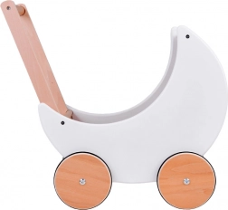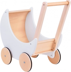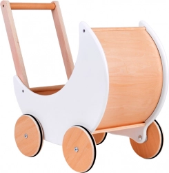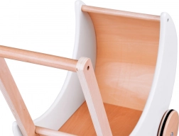 Niedlicher hölzerner Puppenwagen ist ein ideales Spielzeug für kleine Kinder, die laufen lernen. Das minimalistische Design in Kombination mit der soliden Konstruktion gewährleistet eine sichere Nutzung und Stabilität, was die Entwicklung des Gangs erleichtert.