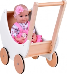 Niedlicher hölzerner Puppenwagen ist aus naturbelassenem Holz gefertigt, das sicher für Kinder ist. Sein ergonomischer Griff ist an kleine Kinderhände angepasst und fördert die Entwicklung des Gleichgewichts. Gummiräder schützen den Boden vor Kratzern und sorgen für einen leisen Lauf.