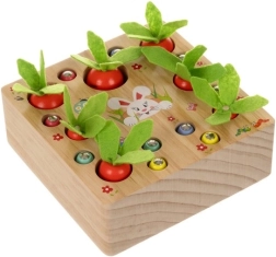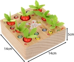 Das Holzspielzeug KRUZZEL 2v1 bringt Freude am Lernen und Spielen in Form eines bunten Gartendesigns. Kinder werden es lieben, Gärtner nachzuahmen, während sie mit magnetischen Würmchen spielen und Möhren in die richtigen Löcher stecken. Das Spiel unterstützt die Form- und Farberkennung und entwickelt dadurch sensorische Fähigkeiten.