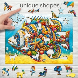 Das Holz-Puzzle Modischer Fisch von WOODEN CITY ist dank seiner speziell geformten Teile, von denen einige die Form von Tieren haben, eine großartige Herausforderung. Diese Figuren können alleine stehen, was das Puzzlespiel bereichert. Das Puzzle besteht aus einer festen HDF Holzfaserplatte mit einer Dicke von 3-4 mm, die seine Langlebigkeit und Qualität gewährleistet. Glatte Kanten ohne Grate werden durch präzise Laserverarbeitung sichergestellt.