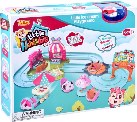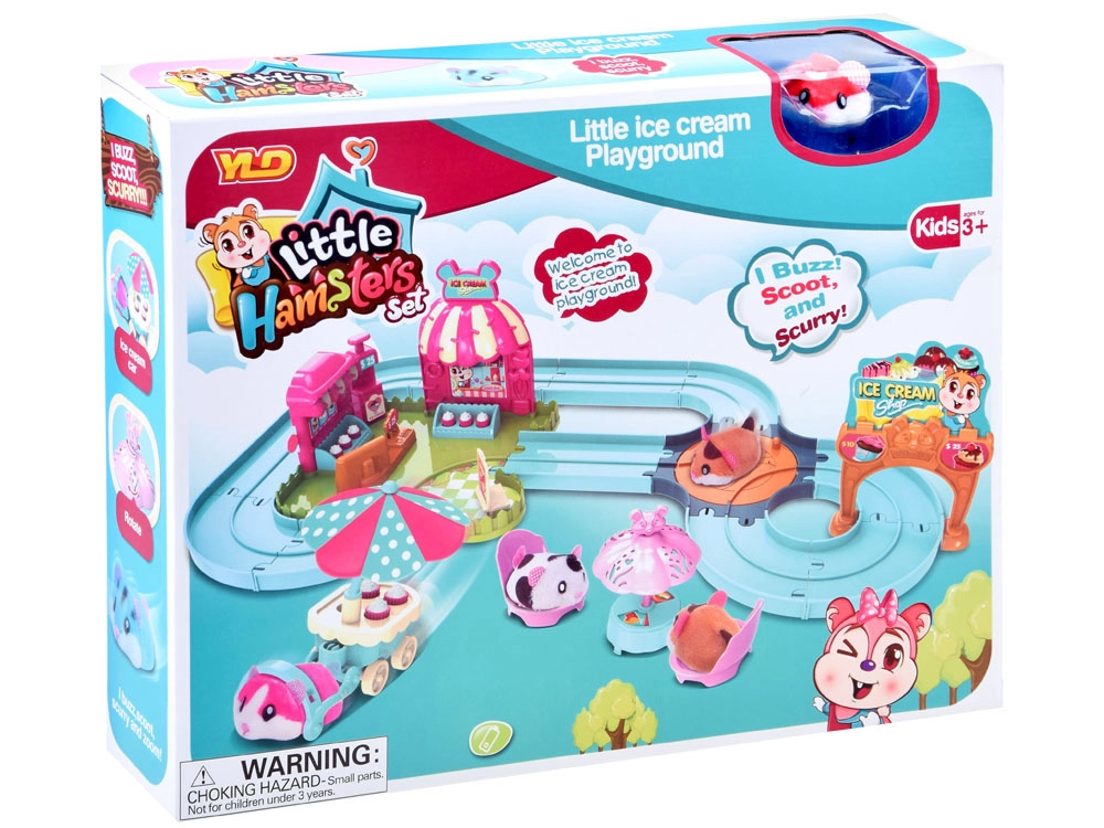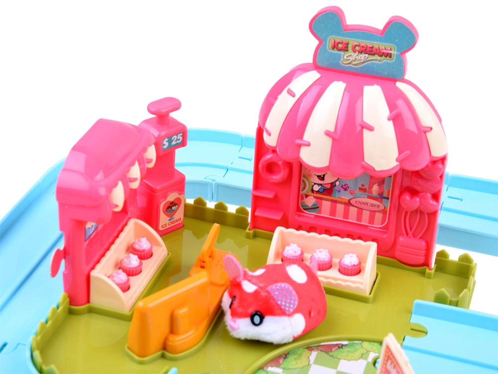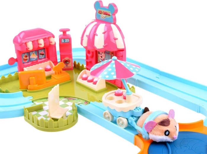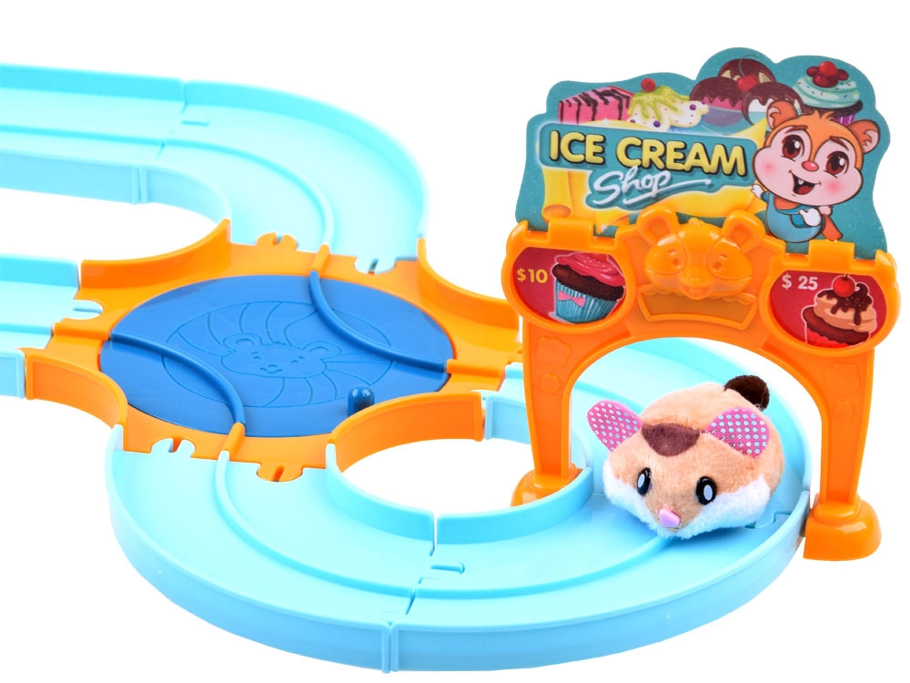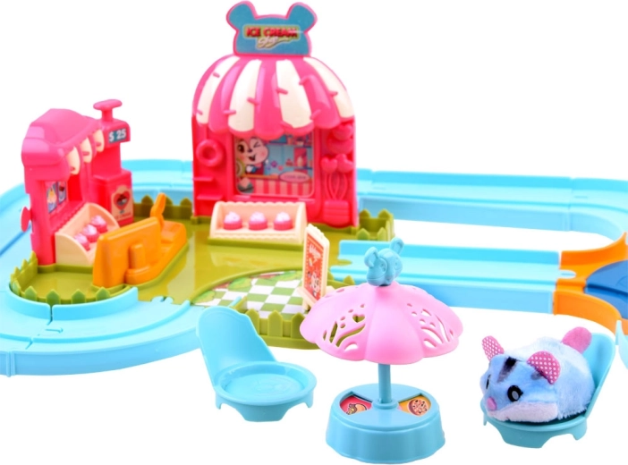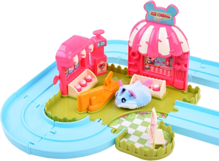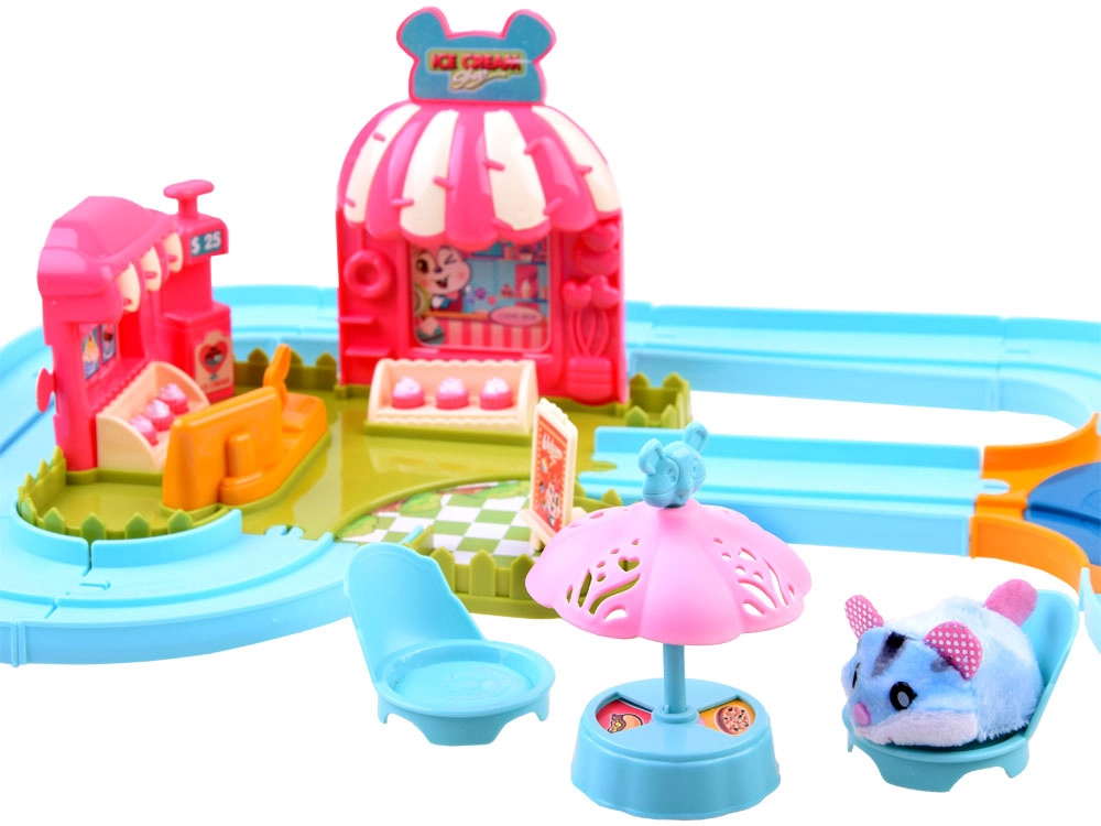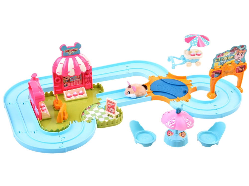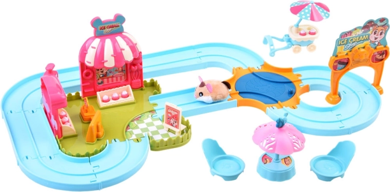 Entdecken Sie eine bunte, interaktive Bahn mit Hamster, die das Zimmer in eine fröhliche Eisdiele verwandelt. Der kleine Plüschhamster bewegt sich nach dem Einschalten selbstständig, ändert die Richtung und kann mit dem Wagen sowohl auf als auch neben der Strecke fahren. Ein Set voller Zubehör – Eisdielen-Stand, Tisch mit Sonnenschirm, Sessel und Leckereien – sorgt für Stunden kreativen Spielens und Rollenspiele.