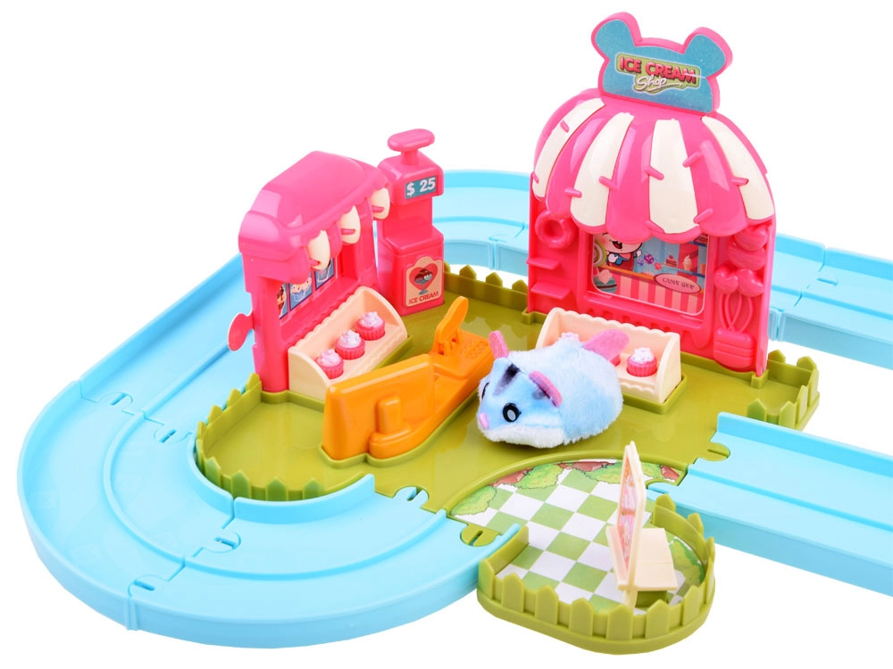 Dieses Spielset bringt die fröhliche Welt einer Eisdiele mit einem niedlichen Hamster, der ein flauschiges Fell hat und sofort nach dem Auspacken einsatzbereit ist – betrieben mit einer AG13-Batterie (im Lieferumfang enthalten). Nach dem Einschalten fährt der Hamster los, ändert selbstständig die Richtung und kann auf der leicht zusammenbaubaren Strecke mit Weiche geführt werden. Mit dem angehängten Wagen liefert er Leckereien an die Gäste.