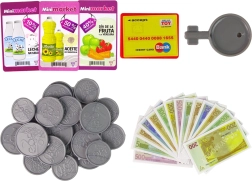 Enthält verschiedene Spielrequisiten wie Flaschen mit Lebensmitteln, Kreditkarten und verschiedene Banknoten und Münzen.