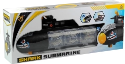 Ein großes U-Boot, das wie ein furchteinflößender Hai aussieht, verbirgt viele interessante Elemente in sich. Was ist darin zu finden? Autos verschiedener Typen und ein Hubschrauber! Das U-Boot mit beidseitigem Sortierer ist ein großartiges Geschenk für Kinder, die Verkehrsmittel und Unterwasserfahrzeuge lieben.