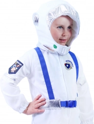 Der weiße Overall mit silbernen Elementen und Aufnähern sorgt für einen realistischen Space-Look, der jeden kleinen Entdecker begeistert.