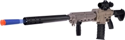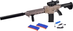 Die leichte Konstruktion aus robustem Kunststoff und der verstellbare Frontgriff erhöhen den Komfort beim Spielen. Die verschiebbare Optik hilft bei präziseren Treffern auf längere Distanz, während das abnehmbare Magazin ein schnelles Auffüllen der Munition ermöglicht. Ein Akku 3,7 V/500 mAh und ein Ladegerät sind enthalten, sodass Sie nach dem Laden sofort loslegen können.
