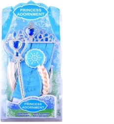 Eine blaue verzierte Anstecknadel mit einem blonden Zopf, die leicht angebracht werden kann, wird dabei helfen, dem Lieblingsmärchencharakter näher zu kommen. Krone und Zepter sind wesentliche Accessoires jeder kleinen Prinzessin, deshalb wurden sie mit blauen Plastikelementen geschmückt. Die Bastelarbeiten und Dekorationen runden das elegante Outfit der kleinen Mädchen ab.
