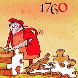 Puzzle Lustige Geschichte, Teil eins (Historia Comica Opus 1) – von der Geburt Christi bis zum Jahr 2000, verpackt in einer ungewöhnlichen dreieckigen Box, die ein Poster als Vorlage zum Puzzeln enthält. Die Beschreibungen der Ereignisse sind dreisprachig (Englisch, Deutsch, Französisch).