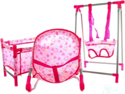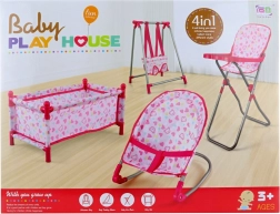 Das 4-in-1-Puppenset enthält eine Liege, eine Schaukel, einen Hochstuhl und ein Bettchen. Packungsgröße ca. 37 × 47,5 × 10 cm. Alter 3+.