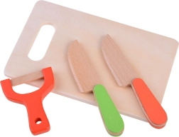 Verpackungsinhalt: Holzkiste, Schneidebrett, beidseitiges Messer, Schäler, verschiedene Obst- und Gemüsesorten wie Tomate, Karotte, Gurke, Paprika, Erdbeeren, Kiwi und mehr.