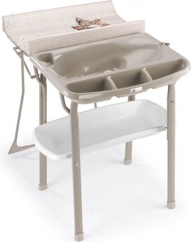 Der Wickeltisch ist die ideale Lösung für eine komfortablere Pflege des Kindes. Der innovativ gestaltete Wickelaufsatz erleichtert die Handhabung mit dem Kind insgesamt, da er direkt neben der Badewanne angebracht ist. So muss das Kind nach dem Bad nicht im Arm gehalten werden, während man mit einer Hand – wie sonst üblich – den Aufsatz installiert. Die Wanne ist mit zwei anatomischen, rutschfesten Einlagen konzipiert – für die Kleinsten von 0 bis 6 Monaten bietet sie eine integrierte Liegefläche, während die andere Seite mit Sitz und Armlehnen für Kinder von 6 bis 12 Monaten bestimmt ist.