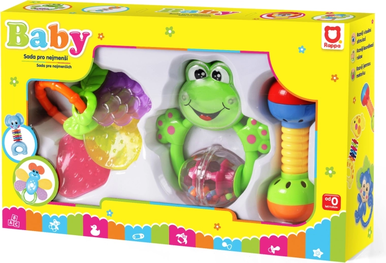 Dieses farbenfrohe 3er-Set umfasst eine Frosch-Rassel, eine Hantel mit rasselnden Elementen und einen Beißring in Obstform. Die Spielzeuge sind leicht, sicher und so gestaltet, dass sie vom Baby einfach gegriffen werden können. Die erzeugten Geräusche und kontrastreichen Farben wecken Neugier und fördern die Sinnesentwicklung.