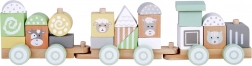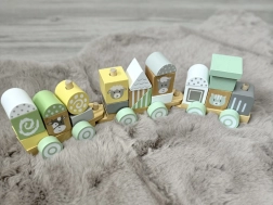 Jeder Waggon dieser Eisenbahn ist solide aus langlebigem Holz gefertigt und lässt sich leicht mit anderen verbinden, was einen langen Zug ergibt, den Kinder auf dem Boden schieben können. Pastellfarben verleihen dem Spielzeug außergewöhnlichen Charme und passen hervorragend in jedes Kinderzimmer.