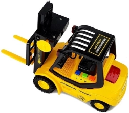 Der Stapler ist in charakteristischen Gelb-Schwarz-Farben gestaltet, die an echte Baumaschinen erinnern. Trotz seiner kompakten Größe enthält das Spielzeug detaillierte Elemente wie das Lenkrad, verschiebbare Gabeln und bunte Tasten, die verschiedene Geräusche von sich geben. Kinder können sich auf Geräusche wie Motorstart, Hupe und Rückwärtsgang freuen.