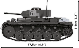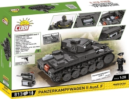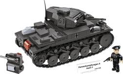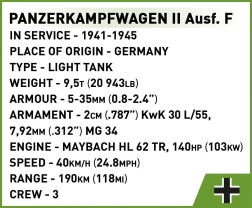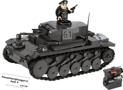 Der Panzer Panzerkampfwagen II war einer der Schlüsselpanzer Deutschlands in der Anfangsphase des Zweiten Weltkriegs. Dieser Bausatz enthält 813 Teile und ist im Maßstab 1:28 gefertigt. Die Teile sind mit hochwertigen Drucken versehen, die beim Spielen nicht abnutzen. Das Modell hat eine öffnende Luke, in die eine Panzerfigur eingesetzt werden kann. Der Turm des Panzers dreht sich um 360 Grad, während die Kanone mit Maschinengewehr nach oben und unten schwenkbar ist. Unter der Luke befindet sich ein Bausatzmotor, der ebenfalls neben dem Modell ausgestellt werden kann. Das Set beinhaltet eine Panzerfigur mit Barett und einer P08 Parabellum Pistole.