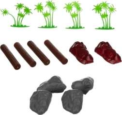 Enthalten sind 14 Elemente (Steine, Felsen, Palmen, Baumstämme), mit denen Kinder Bauernhof-, Safari- und Waldwelten gestalten und ihre Fantasie sowie das Erzählen fördern.