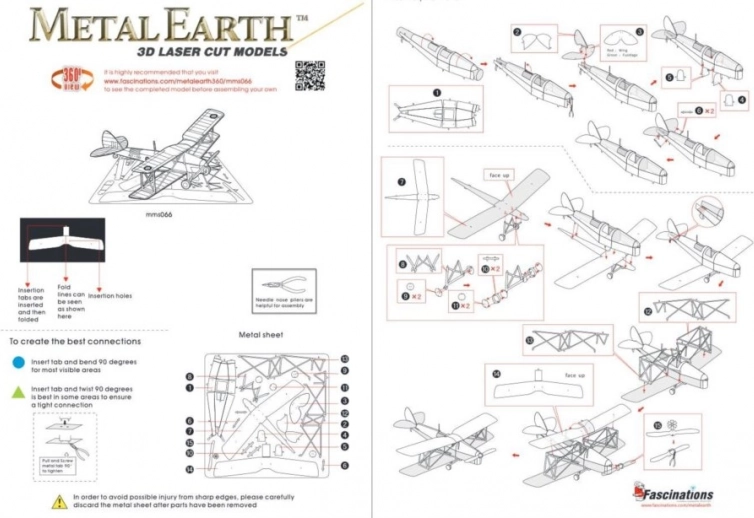 Entnehmen Sie die einzelnen Teile aus den Metallplatten; bei Bedarf verwenden Sie kleine Seitenschneider (nicht enthalten). Die Teile werden mithilfe von Schlössern verbunden, die aus einem Haken (Nase) und einer Öffnung bestehen. Biegen Sie den Haken mit einer kleinen Flachzange (nicht enthalten) um und verbinden Sie Schritt für Schritt alle Schlösser, bis ein äußerst realistisches Meisterstück entsteht!