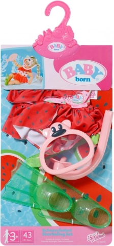 Dieses unterhaltsame Zubehör-Set macht jedes Puppenbad zu einem kleinen Abenteuer. Der farbenfrohe Badeanzug mit Melonenmotiv, die leichten Flossen und die bequeme Schnorchelmaske passen perfekt auf BABY born Puppen in der Größe 43 cm und fördern Fantasie und kreatives Spiel.