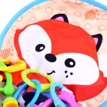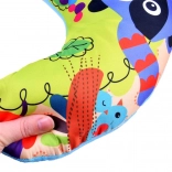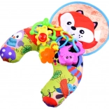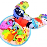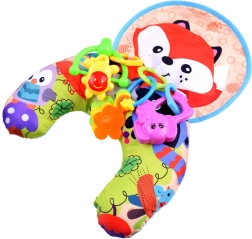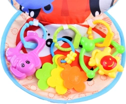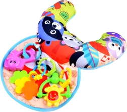 Vor dem Baby befinden sich fröhliche Spielzeuge, die es motivieren, das Köpfchen zu heben und die Rückenmuskulatur zu stärken.