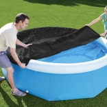 Die praktische BESTWAY-Poolabdeckung ist für den schnellen und sicheren Schutz des Wassers konzipiert. Ablauföffnungen verhindern die Ansammlung von Regenwasser auf der Plane und die umlaufende Zugschnur sorgt dafür, dass die Abdeckung auch bei Wind fest sitzt. Robustes PVC hält dem täglichen Gebrauch stand und lässt sich leicht reinigen.