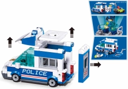 Dieses Polizeiauto besteht aus zusammensteckbaren Kunststoffbausteinen und verfügt über funktionale Elemente wie eine Satellitenschüssel und bewegliche Türen.