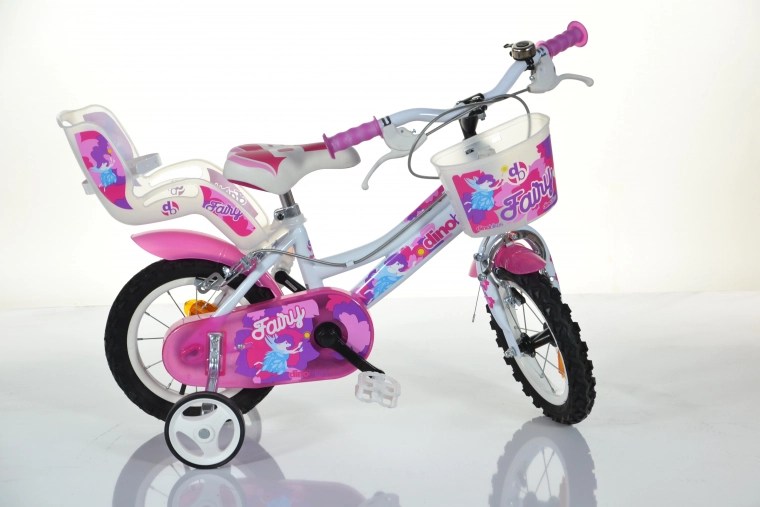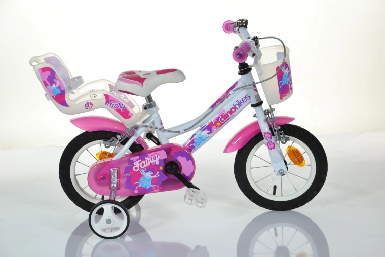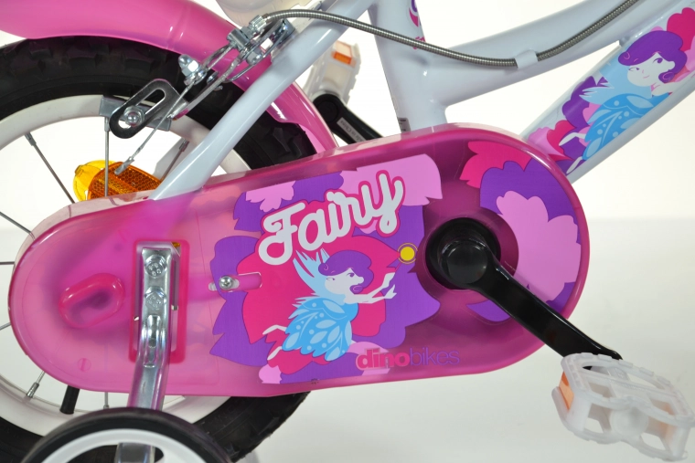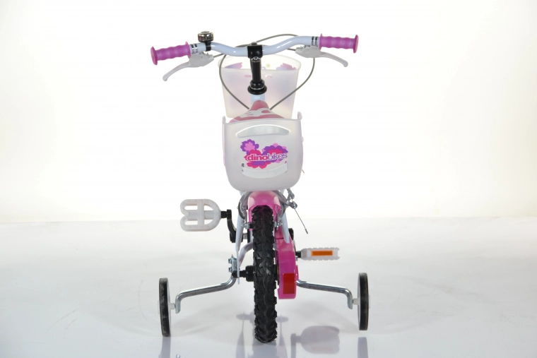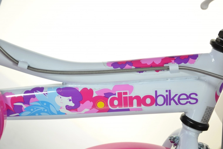 Kinderfahrrad 12" DINO BIKES in Weiß. Stahlrahmen, Stützräder, Schutzbleche und U-Brake-Bremsen. Für Kinder von 85–100 cm. Perfekt für die ersten Fahrten.