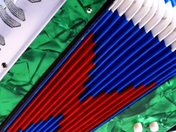 Der blau-rote Balg verleiht Stil und das Instrument erzeugt klare, angenehme Töne, die Kinder und Eltern erfreuen.