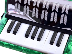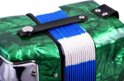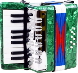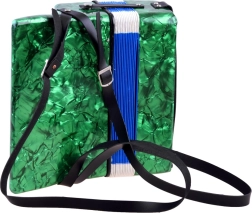 Entdecken Sie die Freude an der Musik mit diesem großen Kinderakkordeon in grüner Ausführung. Es sieht aus wie ein echtes Instrument, fördert die Feinmotorik, das musikalische Gehör und das Unterscheiden von Tönen. Dank der Tasten und Basstasten, dem bequemen Trageriemen und der Arretierung des Balgs ist das Spiel einfach und sicher – ideal für kleine Musikanfänger.