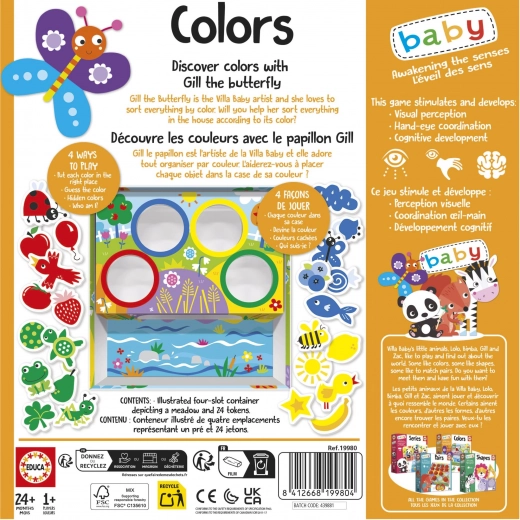 Das Lernset Educa Baby mit dem Schmetterling Greta ist das ideale Hilfsmittel für die erste Begegnung mit Farben. Kinder ordnen bunte Elemente den passenden Öffnungen in der Box zu und entwickeln so ganz natürlich die Hand-Auge-Koordination, Feinmotorik und Konzentration. Große und robuste Teile sind an kleine Hände angepasst.