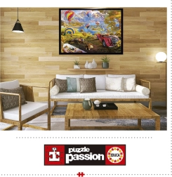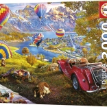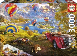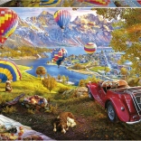 Die Landschaft mit See, Bergen und bunten Ballons, ergänzt durch ein rotes Cabrio und ein Picknick, bietet zahlreiche Details, die das Puzzeln angenehmer und schneller machen.