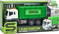 Der Reibungsantrieb der Hinterachse lässt das Fahrzeug nach einem Anschubsen sanft nach vorne fahren, während Soundeffekte das Spielerlebnis intensivieren. Zum Set gehören 2 Kunststofftonnen, in die kleine Gegenstände eingeworfen werden können. Das Spielzeug besteht aus hochwertigen Materialien für Langlebigkeit und sicheres Spielen.