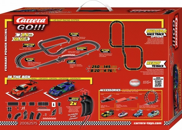 Erleben Sie die Spannung echter Rennen mit der CARRERA GO Ferrari Power Racing Autorennbahn mit einer Länge von 8,6 m. Das Set enthält zwei detailreiche Fahrzeuge FERRARI 296 GT3, eine Kreuzung, überhöhte Kurven, eine Fahrbahnverengung sowie einen Rundenzähler. Dank Handreglern mit Turbo-Funktion, Magneten und doppelten Schleifkontakten genießen Sie schnelles und flüssiges Fahren mit hoher Haftung. Die einfache Montage mit Clip-System und die vielseitigen Erweiterungsmöglichkeiten garantieren endlosen Fahrspaß für Kinder ab 6 Jahren und Erwachsene.