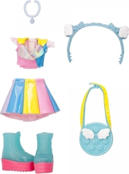 Puppe, 2 Kleidungsstücke, Handtasche, Stirnband, Schuhe, Socken, Halskette