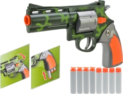 Das Set enthält eine kompakte Pistole mit Tarnmuster, die bequem in einer Hand gehalten werden kann. Patronen aus Schaumstoff und weichem Gummi bieten maximale Sicherheit und Leichtigkeit. Das Set enthält 6 Patronen.