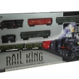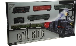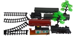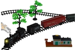 Enthalten sind eine Lokomotive, ein Güterwagen, drei kleinere Waggons, ein Bahnhof, zwei Bäume, Schienen und ein Wasserdosierer für den Raucheffekt. Einfach 4 AA-Batterien (nicht enthalten) in den Güterwagen einlegen, mit der Lokomotive verbinden und nach kurzer Aufheizzeit des Heizelements auf die Strecke gehen.