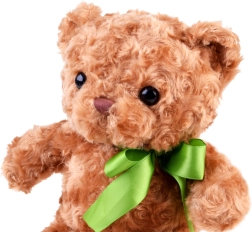 Glänzende schwarze Augen, ein kleiner brauner Nasenknopf und die auffällige grüne Schleife verleihen dem Spielzeug einen individuellen und freundlichen Look.