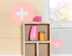 Das Set enthält rosa medizinisches Zubehör wie Schere und Maske, die ideal für Doktorspiele sind.