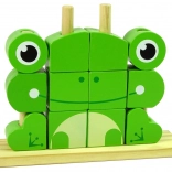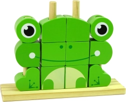 Das kreative Holzpuzzle in Froschform ist für Kinder entworfen, um sie zum Erschaffen anzuregen und die Koordination zu lernen. Das Puzzle enthält 12 Teile, die auf eine Basis mit Stiften gesteckt werden können, um verschiedene Tiere oder Objekte nach Fantasie zu kreieren.