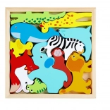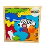 Dieses farbenfrohe Holzpuzzle bringt Kindern Freude am Entdecken der Tierwelt. Die Aufgabe besteht darin, die einzelnen Tierteile korrekt auf der Grundplatte zuzuordnen – jedes Teil hat eine andere Form, sodass Kinder Formwahrnehmung und Geduld üben. Das Set enthält 12 Tiere, zum Beispiel Löwe, Zebra, Äffchen und Schwertwal.