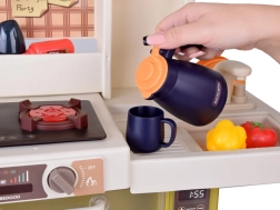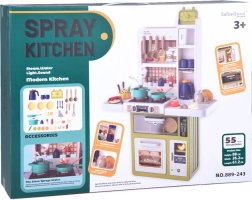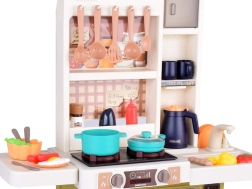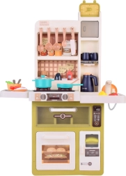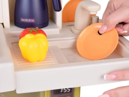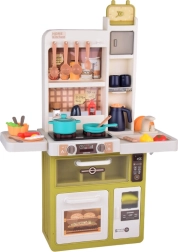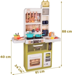 Diese Kinderküche imitiert eine echte Küche detailgetreu und motiviert Kinder zum Rollenspiel. Enthalten sind ein Spülbecken mit Wasserumlauf, ein Kochfeld mit Licht-, Sound- und Dampfeffekten, eine Dunstabzugshaube sowie eine Uhr mit beweglichen Zeigern. Aufklappbare Türen an Kühlschrank, Ofen und Geschirrspüler erhöhen die Realitätsnähe und fördern Ordnungssinn und Organisation.