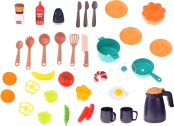 Topf mit Deckel, Stielkasserolle, Kanne, Tassen, Teller, Besteck, Schöpflöffel, Pfannenwender, Sieb sowie Lebensmittel-Attrappen – alles, was kleine Köche brauchen.