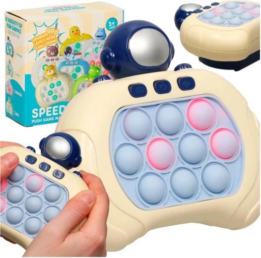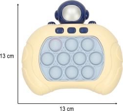 Ein unterhaltsames elektronisches sensomotorisches Spielzeug mit Astronautenmotiv bietet 4 Spielmodi, leuchtende Pop-it-Tasten und eine ergonomische Form für bequemes Halten. Es trainiert Reflexe, Gedächtnis und Feinmotorik, bietet eine Lautstärkeregelung und kompakte Abmessungen von 13 × 13 cm – ideal für unterwegs und zu Hause.