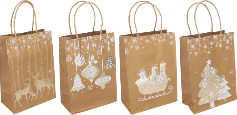 Wählen Sie aus 4 festlichen Varianten, die jedes Geschenk wunderschön ergänzen. Die Tasche ist wiederverwendbar und umweltfreundlich.